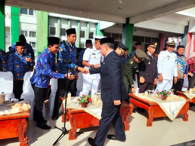 Keterangan Gambar : Wakil Bupati Anambas, Wan Zuhendra saat menyalami peserta upacara